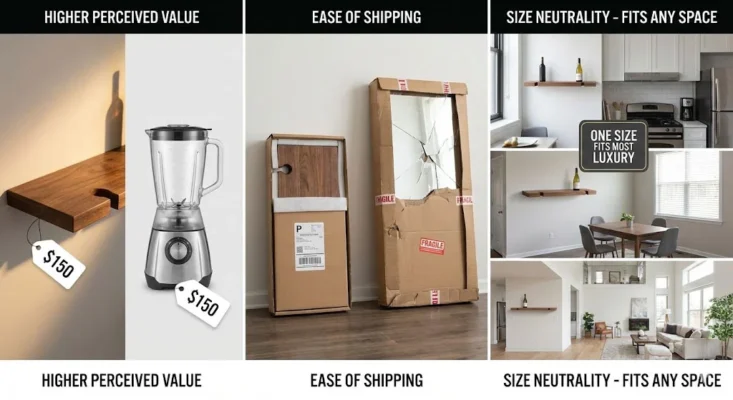 • Size Neutrality: You don’t need to know the exact dimensions of their living room to know a floating shelf will fit. It is a “one size fits most” luxury item.